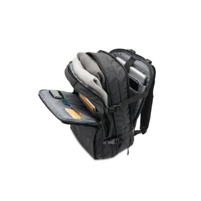 Mochilas Mochila de viagem em poliéster reciclado (rPET) 600D de alta densidade, com acabamento repelente à água. Composta por 3 compartimentos principais com forro em poliéster reciclado (rPET) 210D: compartimento traseiro com bolso para notebook até 17.3" e bolso para tablet até 10.1", compartimento central expansível com zíper destinado à arrumação de roupa e um compartimento frontal com vários bolsos interiores. Capacidade até 29 L 32,0 cm x 46,0 cm x 20,0 cm 800 g