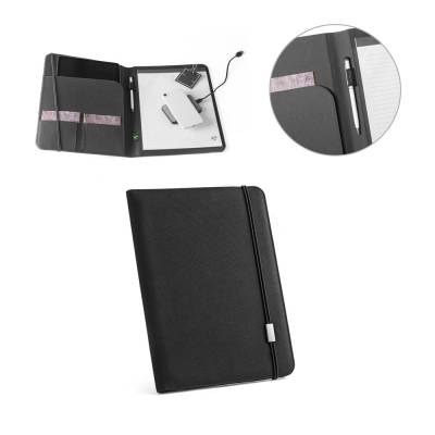 Pastas Pasta A4 em poliéster 100% reciclado 300D, com elástico para fecho. O interior contém vários bolsos, suporte para esferográfica (não inclusa) e um caderno com 40 páginas pautadas, em papel proveniente de gestão florestal sustentável. 23,0 cm x 33,0 cm x 5,0 cm 499 g