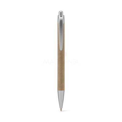 Esferográfica em papel 100% reciclado e detalhes em ABS reciclado (100% rABS). Possui clipe e escrita em azul. Uma esferográfica com materiais reciclados para dar destaque à sua marca.