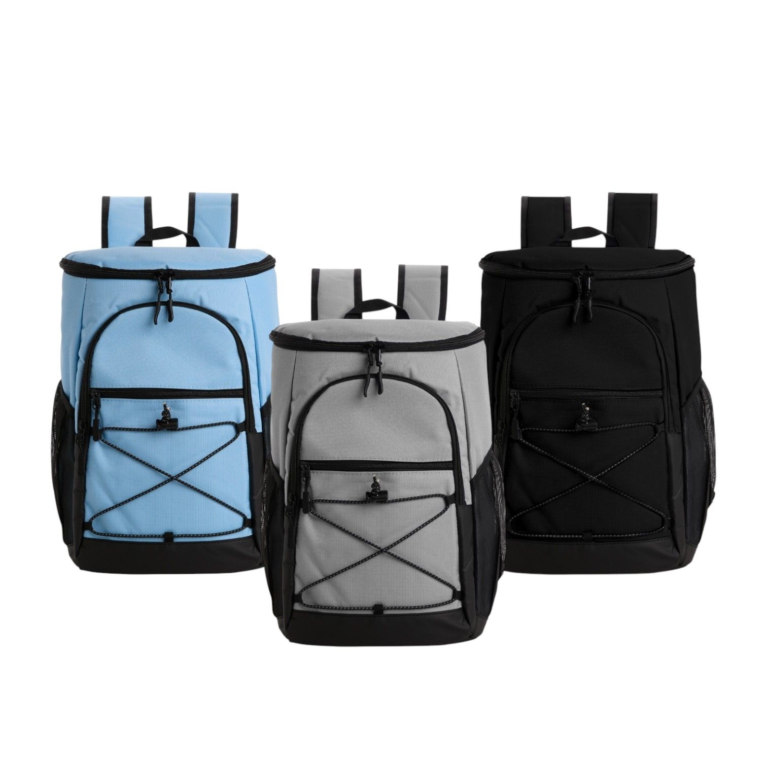 Bolsas Térmicas Mochila térmica confeccionada em poliéster impermeável com detalhes em couro sintético e capacidade máxima de 13 litros, distribuída em dois compartimentos revestidos em PEVA: um interno antivazamento e outro, menor, localizado na parte externa. Possui ainda três bolsos externos, incluindo dois em tela de nylon com elástico e um com fechamento em zíper e cordão de elástico ajustável, além de alças e painel traseiro revestidos em espuma respirável. 35,0 cm x 26,0 cm x 17,0 cm 431 g