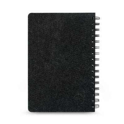 Caderno A5 de capa semi-rígida em feltro 100% reciclado, com argolas. Contém 160 páginas pautadas (70 g/m²) em papel cor de marfim 100% reciclado.