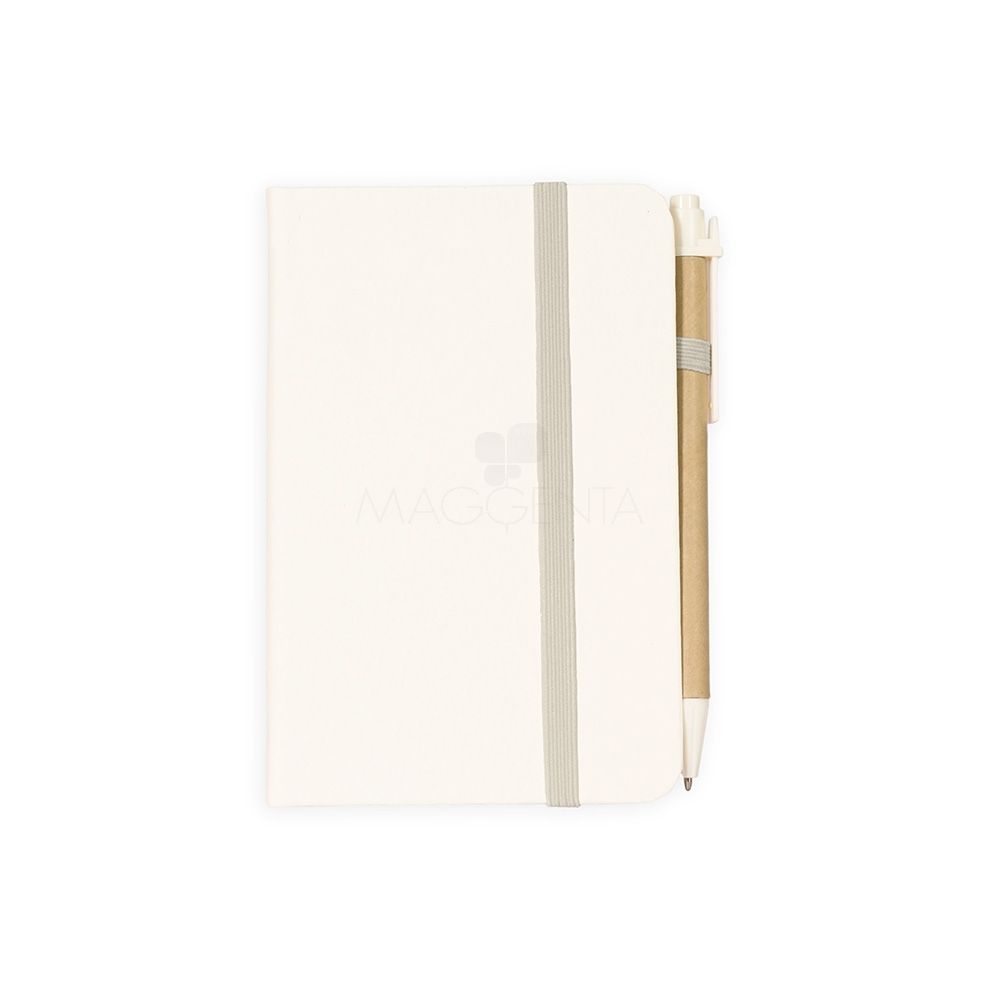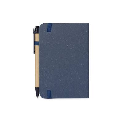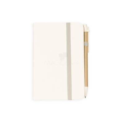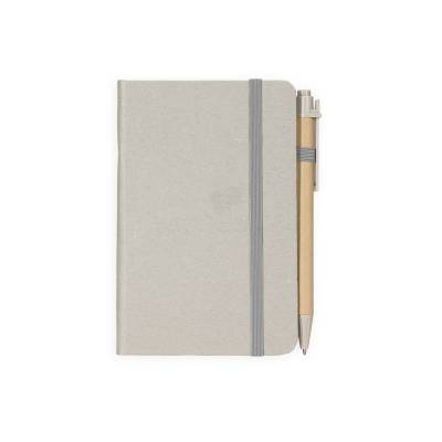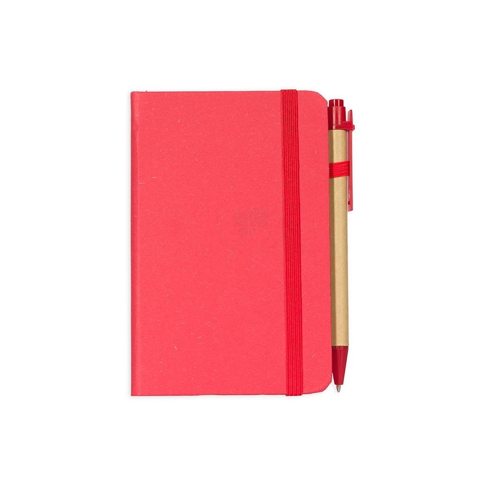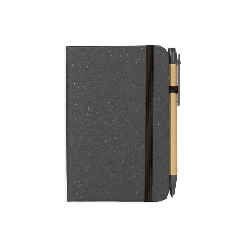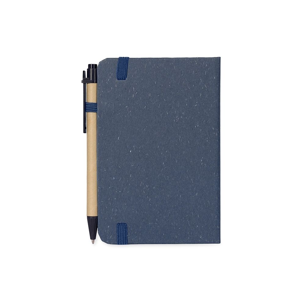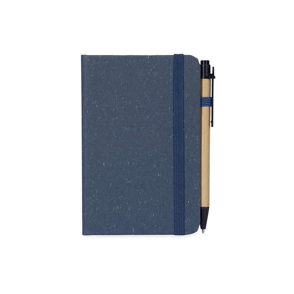 Bloco para Anotações Caderneta ecológica de capa dura revestida em fibra de palha de trigo. Contém aproximadamente 80 folhas brancas com pauta, além de duas folhas de guarda, uma fita para fechamento e porta-canetas elástico. Acompanha uma caneta esferográfica de carga azul de 1,0mm com corpo em papelão e clip, acionamento por clique e ponteira em plástico. 9,3 cm x 14,0 cm x 1,3 cm 107 g