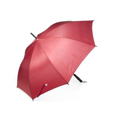 Guarda-chuva em poliéster com abertura automática, estrutura metálica com oito varetas e pegador em plástico com alça de nylon fixa na extremidade.