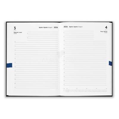 Agenda A5 em PU. Possui 2 bolsos exteriores na capa para guardar pequenos objetos e um marcador em fita. Está organizada num plano diário (70 g/m²).