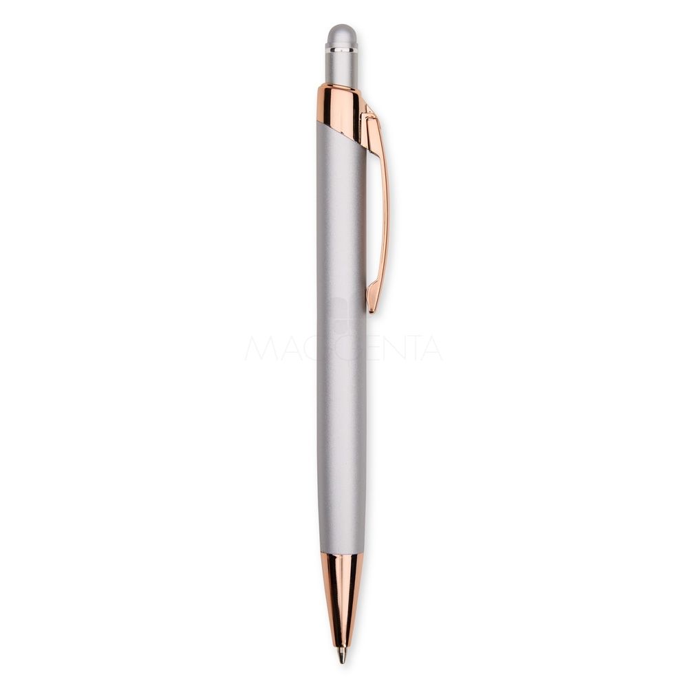 Caneta metálica com carga esferográfica azul de 1,0mm e acionamento por clique de revestimento emborrachado para interação em dispositivos com telas sensíveis ao toque.