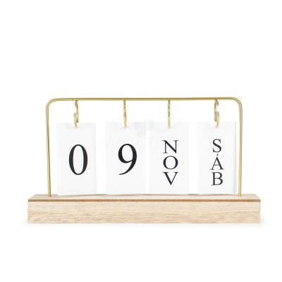 Calendário permanente de mesa com base feita em MDF e moldura de ferro. Conta com fichas em papel cartão que permitem montar a data, trazendo o dia em números e o mês e os dias da semana em versões abreviadas.