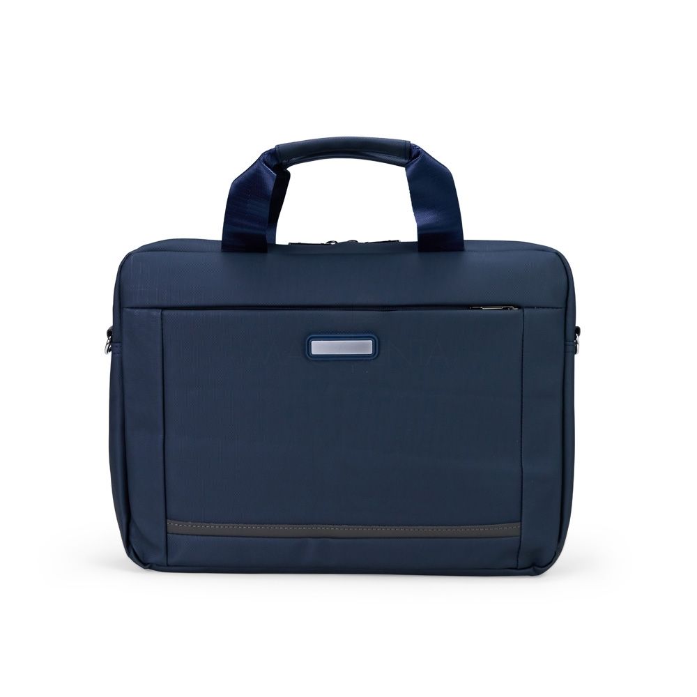 Pasta para notebook confeccionada em couro sintético impermeável com fechamento em zíper e capacidade para aparelhos de até 15,6 polegadas. Possui dois compartimentos: o principal, com revestimento acolchoado, quatro bolsos abertos de tamanhos diferentes e duas divisórias para canetas; e o frontal, com plaquinha metálica fixa na parte externa. Conta ainda com duas alças de mão e um par de abas metálicas para alças removíveis. Acompanha alça de ombro ajustável.