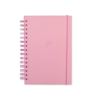 Caderno com capa dura em couchê, encadernação wire-o, marcador de páginas em fita de cetim e elástico para fechamento. Conta com aproximadamente 160 folhas brancas com pauta.