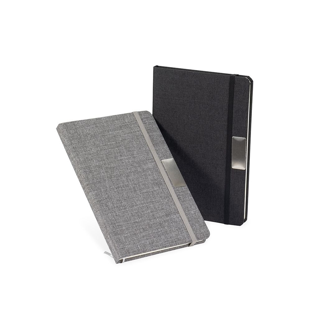 Caderneta em capa com acabamento em tecido de algodão, plaquinha metálica personalizável, elástico para fechamento, marca-páginas em fita de cetim e aproximadamente 96 folhas marfim pautadas.