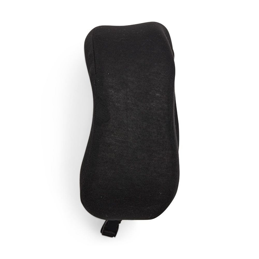 Almofada de pescoço com design anatômico, enchimento em espuma viscoelástica macia em poliuretano e capa em poliéster. Possui alças ajustáveis em nylon e fechamento com engate plástico.