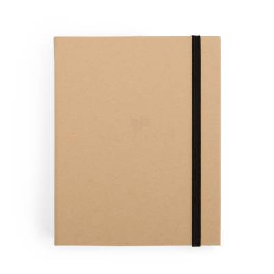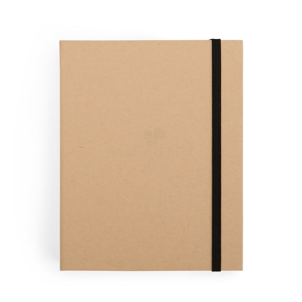 Bloco de anotações com capa dura em kraft e fechamento por elástico. Possui aproximadamente 80 folhas de tonalidade marfim sem pautas e cinco canetas coloridas de ponta dupla: uma fina e outra tipo pincel.