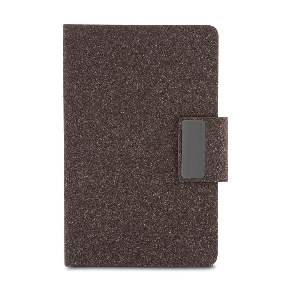 Caderno de anotações com capa em PU e fibra de chá ou café, 80 folhas 70 g/m², engate para caneta com fechamento magnético e placa de metal, não acompanha caneta.
