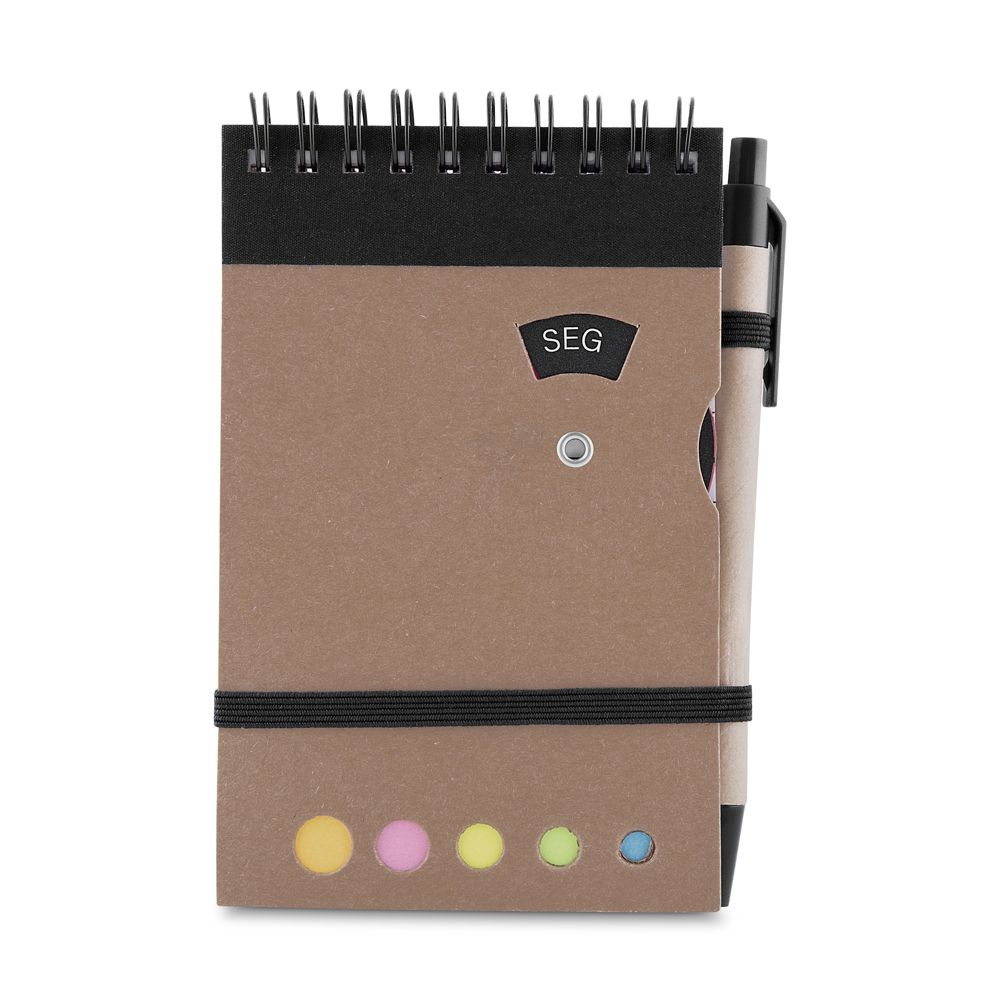 Mini Caderno com capa em papel kraft, com 70 folhas pautadas e blocos adesivos (sticky notes) coloridos. Acompanha disco rotativo na capa com os dias da semana e caneta produzida em papelão reciclado com detalhes em plástico e escrita em azul.