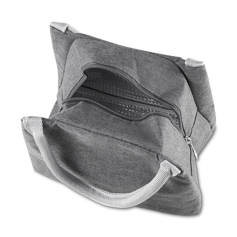 Bolsa térmica com alça de mão, confeccionada em poliéster 300D na parte externa e alumínio com manta térmica no interior. Modelo costurado, puxador de zíper em formato de colher, sem solda e capacidade para 5,6 litros.